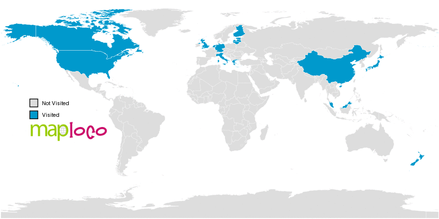 I've been to Canada, China, Estonia, Finland, Germany, Greece, Holy See (Vatican City State), Hong Kong, Italy, Japan, Latvia, Lithuania, Macao, Malaysia, Netherlands, New Zealand, Singapore, United Kingdom, United StatesWhere have you been?
