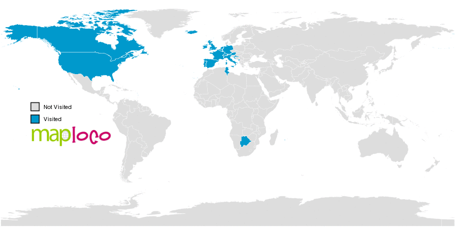 I've been to Austria, Belgium, Botswana, Canada, Croatia, France, Germany, Holy See (Vatican City State), Iceland, Ireland, Italy, Luxembourg, Malta, Montenegro, Netherlands, Portugal, Spain, Switzerland, Tunisia, United Kingdom, United StatesWhere have you been?