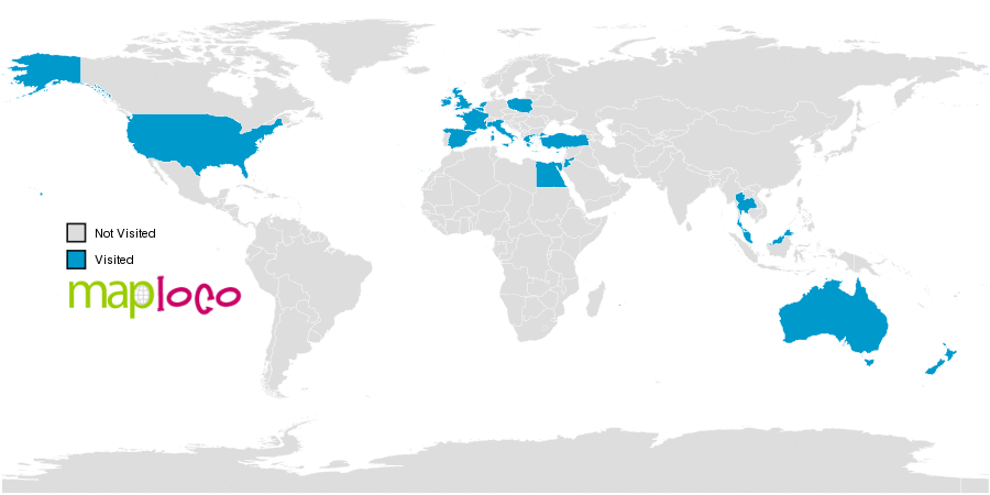 I've been to Australia, Belgium, Cyprus, Egypt, France, Gibraltar, Greece, Guernsey, Holy See (Vatican City State), Hong Kong, Ireland, Italy, Jordan, Malaysia, Monaco, Netherlands, New Zealand, Poland, Singapore, Spain, Thailand, Turkey, United Kingdom, United StatesWhere have you been?