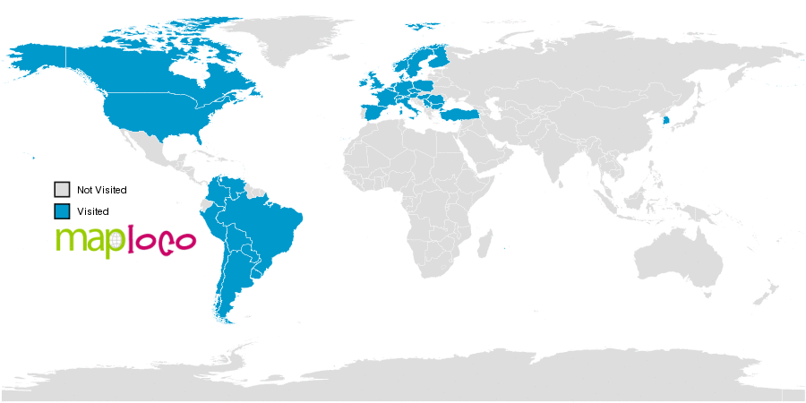 I've been to Argentina, Austria, Belgium, Bolivia, Brazil, Bulgaria, Canada, Chile, Colombia, Czechia, Denmark, Finland, France, Germany, Holy See (Vatican City State), Hungary, Ireland, Italy, Netherlands, Norway, Paraguay, Peru, Poland, Romania, Serbia, South Korea, Spain, Sweden, Switzerland, Turkey, United Kingdom, United States, Uruguay, VenezuelaWhere have you been?