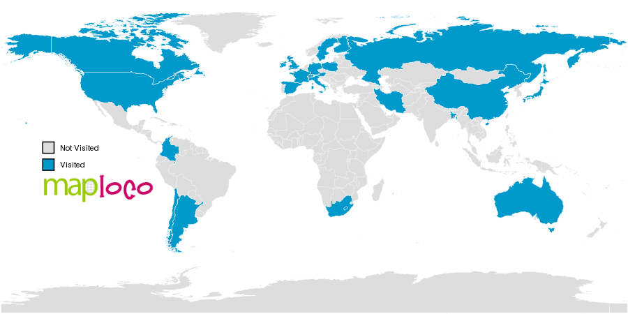 I've been to Argentina, Australia, Austria, Bangladesh, Canada, Chile, China, Colombia, Finland, France, Germany, Iran, Ireland, Italy, Japan, Poland, Russia, South Africa, Spain, Sweden, Switzerland, United Kingdom, United StatesWhere have you been?