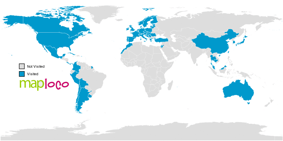 I've been to Argentina, Australia, Austria, Belgium, Bolivia, Bosnia and Herzegovina, Cambodia, Canada, Chile, China, Colombia, Costa Rica, Croatia, Cuba, Czechia, Denmark, Estonia, Finland, France, French Guiana, Germany, Gibraltar, Greece, Holy See (Vatican City State), Hungary, Ireland, Israel, Italy, Japan, Jordan, Latvia, Lithuania, Malaysia, Malta, Mexico, Montenegro, Morocco, Netherlands, Norway, Palestine, Panama, Peru, Poland, Portugal, Puerto Rico, Romania, San Marino, Serbia, Singapore, Slovakia, Slovenia, South Korea, Spain, Sweden, Switzerland, Taiwan, Thailand, Turkey, United Kingdom, United States, UruguayWhere have you been?