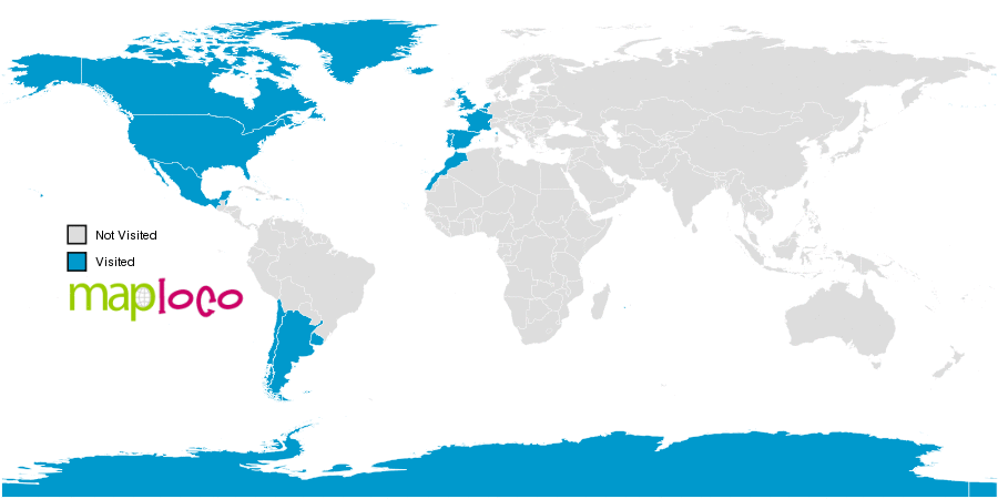 I've been to Antarctica, Argentina, Bahamas, Barbados, Belgium, Belize, Bermuda, Cabo Verde, Canada, Cayman Islands, Chile, Falkland Islands, France, Greenland, Iceland, Jamaica, Mexico, Morocco, Netherlands, Portugal, Puerto Rico, Saint Kitts and Nevis, Saint Lucia, Saint Martin (French part), Sint Maarten (Dutch part), Spain, United Kingdom, United States, Uruguay, Virgin Islands, British, Virgin Islands, U.S.Where have you been?