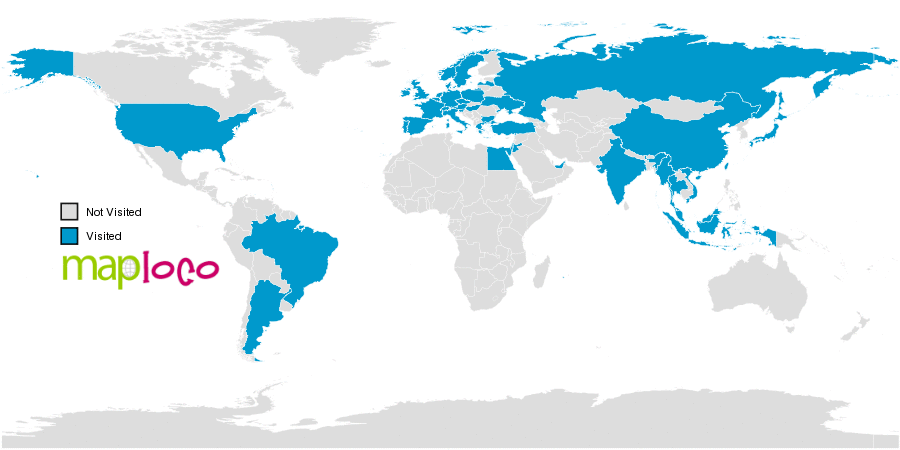 I've been to Argentina, Austria, Belgium, Brazil, Bulgaria, China, Czechia, Denmark, Egypt, France, Germany, Greece, Holy See (Vatican City State), Hong Kong, Hungary, India, Indonesia, Ireland, Israel, Italy, Japan, Jordan, Latvia, Luxembourg, Malaysia, Myanmar, Netherlands, Norway, Poland, Portugal, Russia, San Marino, Slovenia, Spain, Sweden, Switzerland, Taiwan, Thailand, Turkey, Ukraine, United Arab Emirates, United Kingdom, United States, Viet NamWhere have you been?